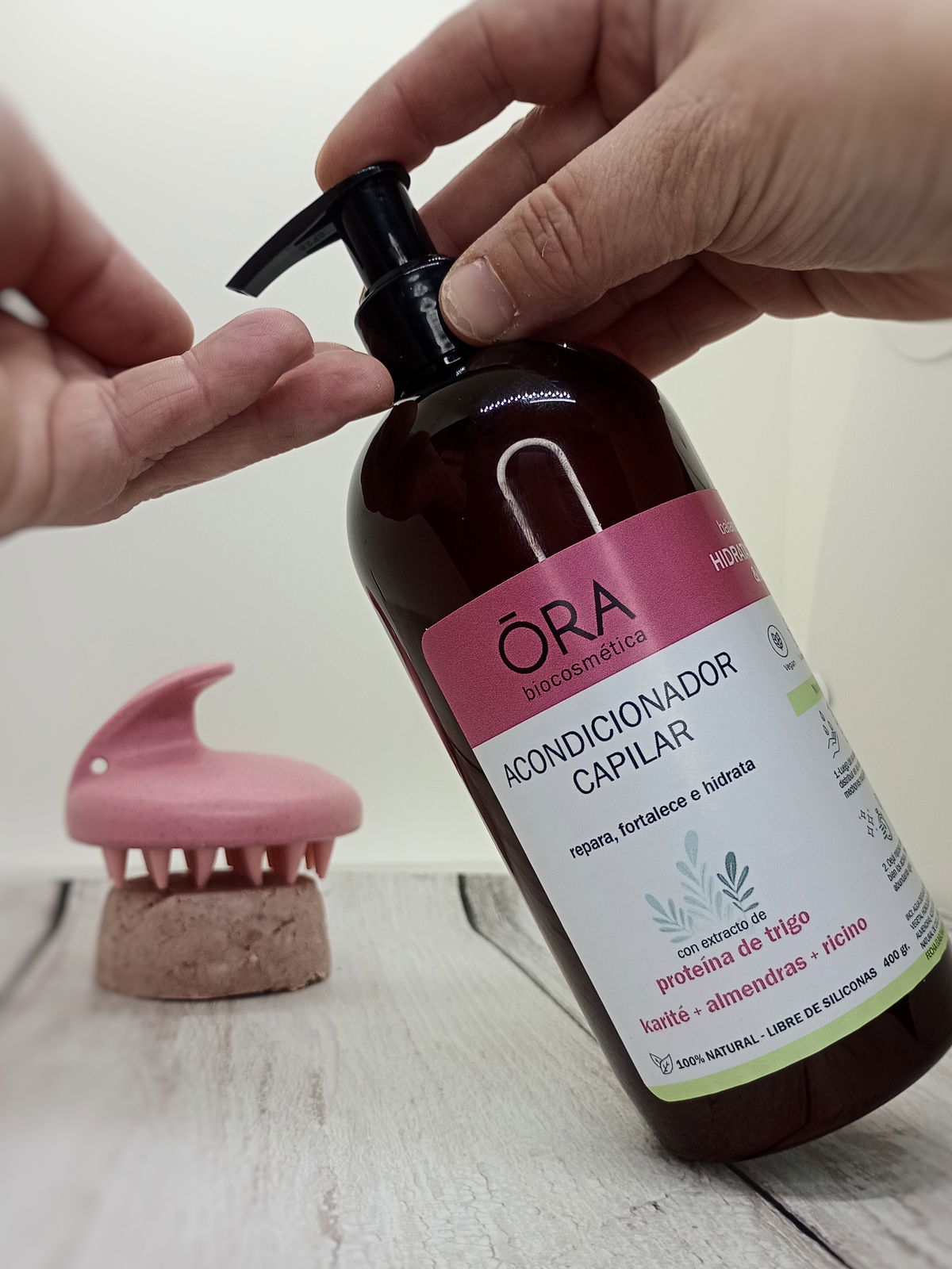 con proteína de trigo, karité, almendras y ricino.